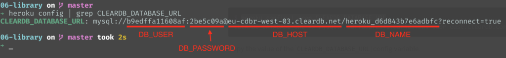 Vi pratade även om miljö-variabler och att vi kan sätta dem i heroku med hjälp av heroku config set i terminalen eller via Heroku dashboard i webbläsaren. Se screenshot nedan för hur man plockar ut de olika delarna vi behöver från den URL vi får från ClearDB: