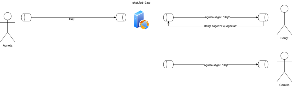 Lite som plåtburkar med ett snöre emellan, meddelanden kan flyta åt båda hållen. Och servern har en plåtburk för varje klient och kan skicka vidare meddelanden som den ”hör” från en klient till alla andra.