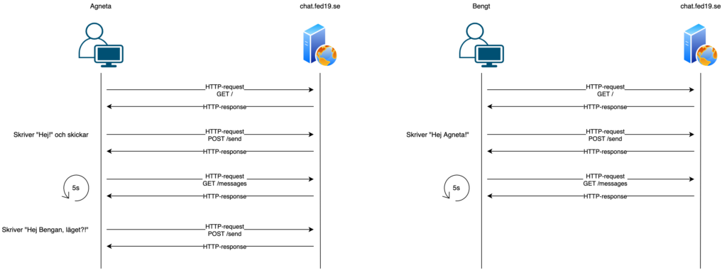 Lite som plåtburkar med ett snöre emellan, meddelanden kan flyta åt båda hållen. Och servern har en plåtburk för varje klient och kan skicka vidare meddelanden som den ”hör” från en klient till alla andra.