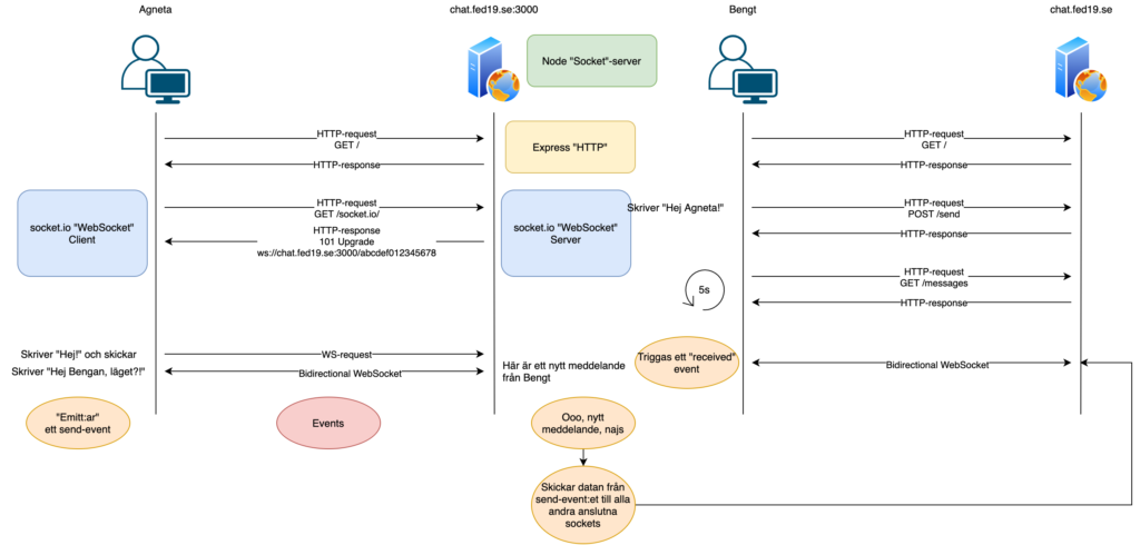Kortfattat så gör WebSockets att vi får dubbelriktad kommunikation mellan en klient och servern, där både klienten kan skicka meddelanden (events) till servern och servern kan skicka meddelanden (events) till klienten.