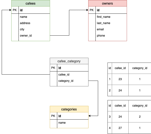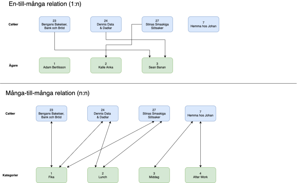 Vi avslutade dagen med att prata om ”många-till-många relationer” (n:n) och satte upp en tabell för café-kategorier och resonerade kring syftet med en relations-tabell/länk-tabell.