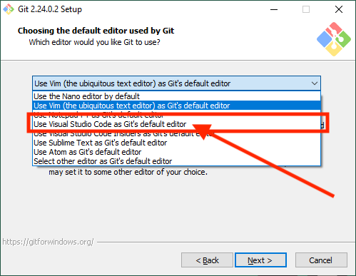 Hämta hem Git for Windows från https://gitforwindows.org/ och starta installationen men när du får frågan om vilken editor du vill att git ska använda så välj ”Use Visual Studio Code as Git’s default editor”!